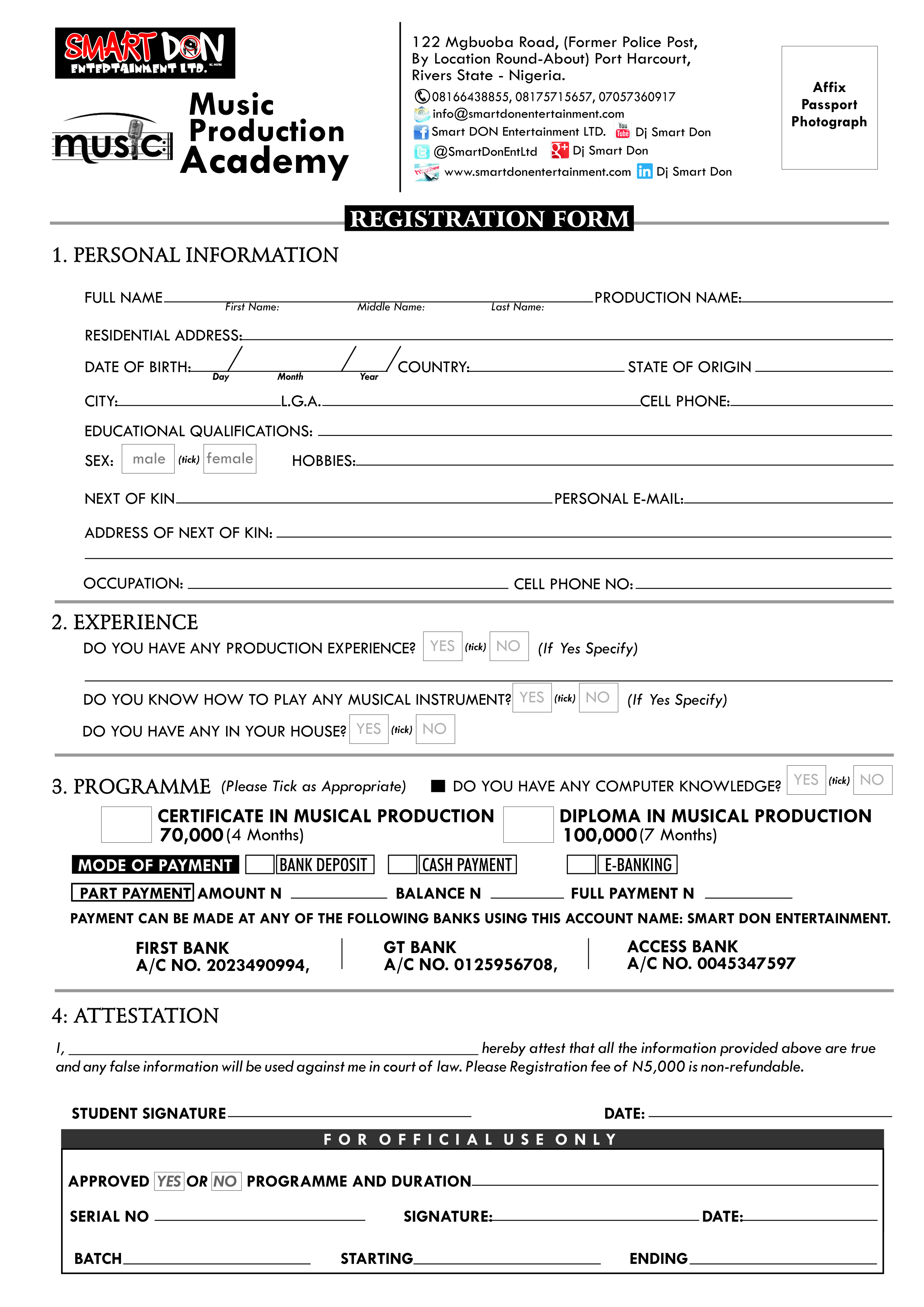 SMART MUSIC PRODUCTION REGISTRATION FORM